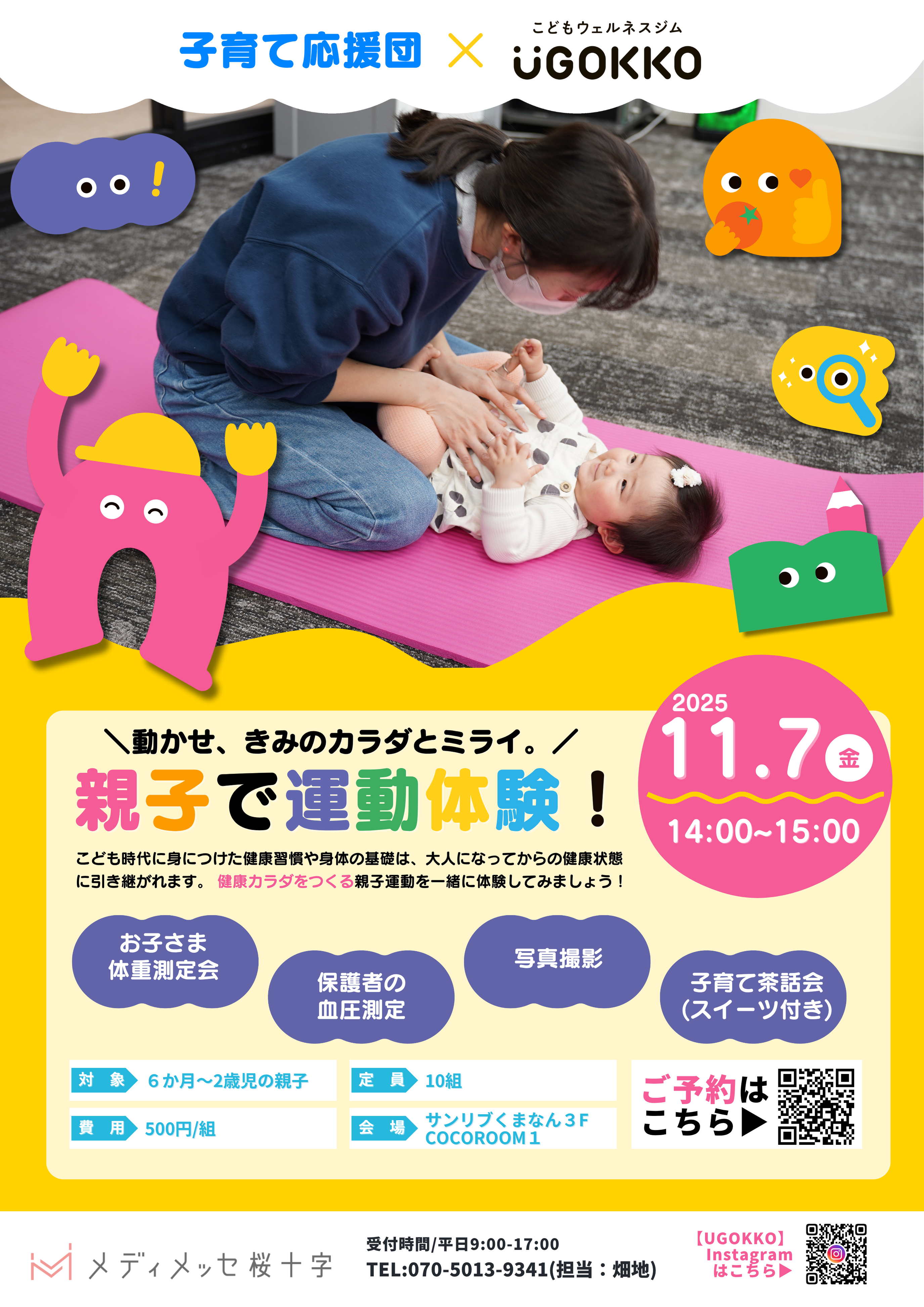 こども時代に身につけた健康習慣や身体の基礎は、大人になってからの健康状態に引き継がれます。健康カラダをつくる親子運動を一緒に体験してみましょう! 保健師・看護師・管理栄養士への相談もできます!