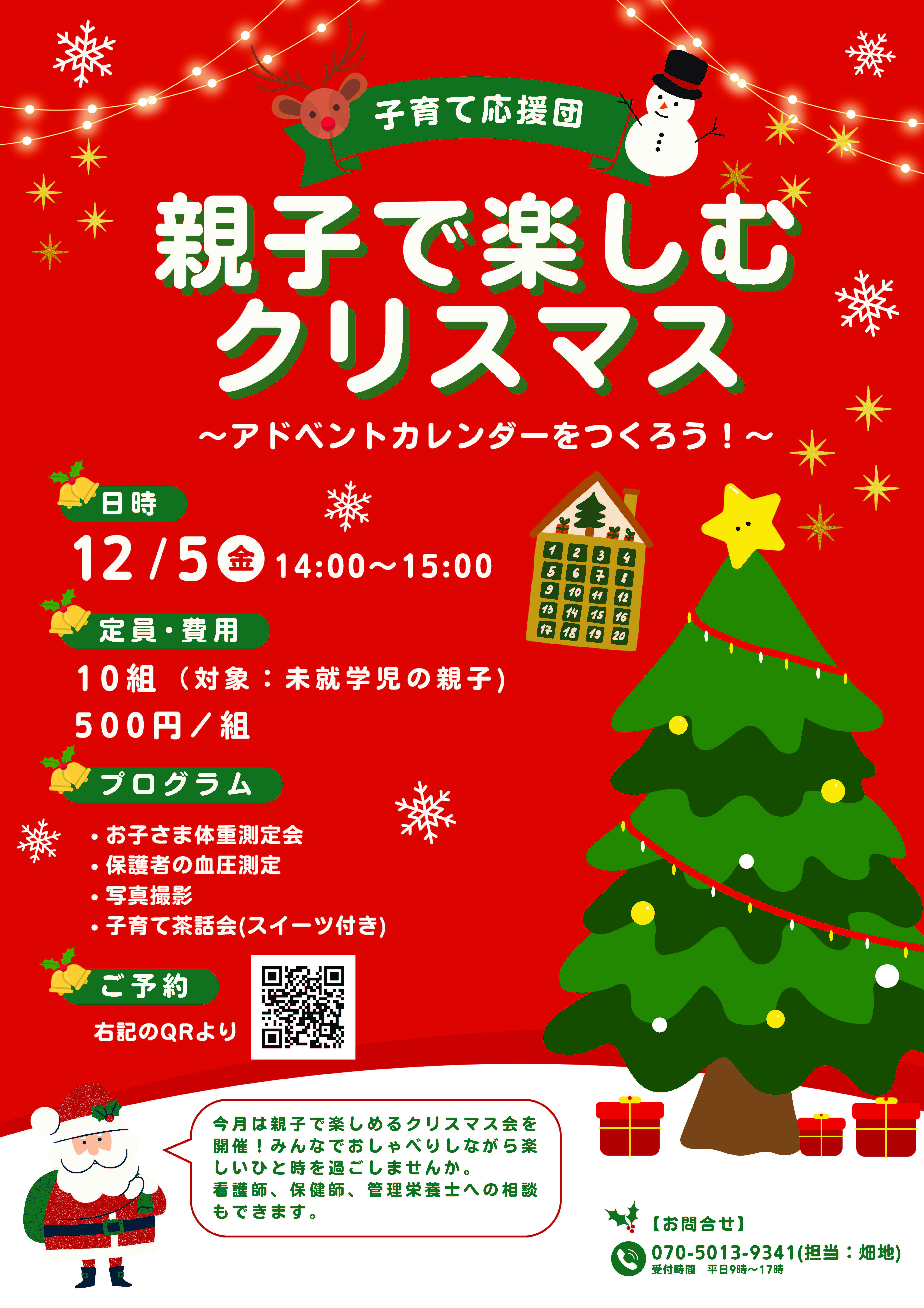 今月は親子で楽しめるクリスマス会を開催!みんなでおしゃべりしながら楽しいひと時を過ごしませんか。看護師、保健師、管理栄養士への相談もできます。