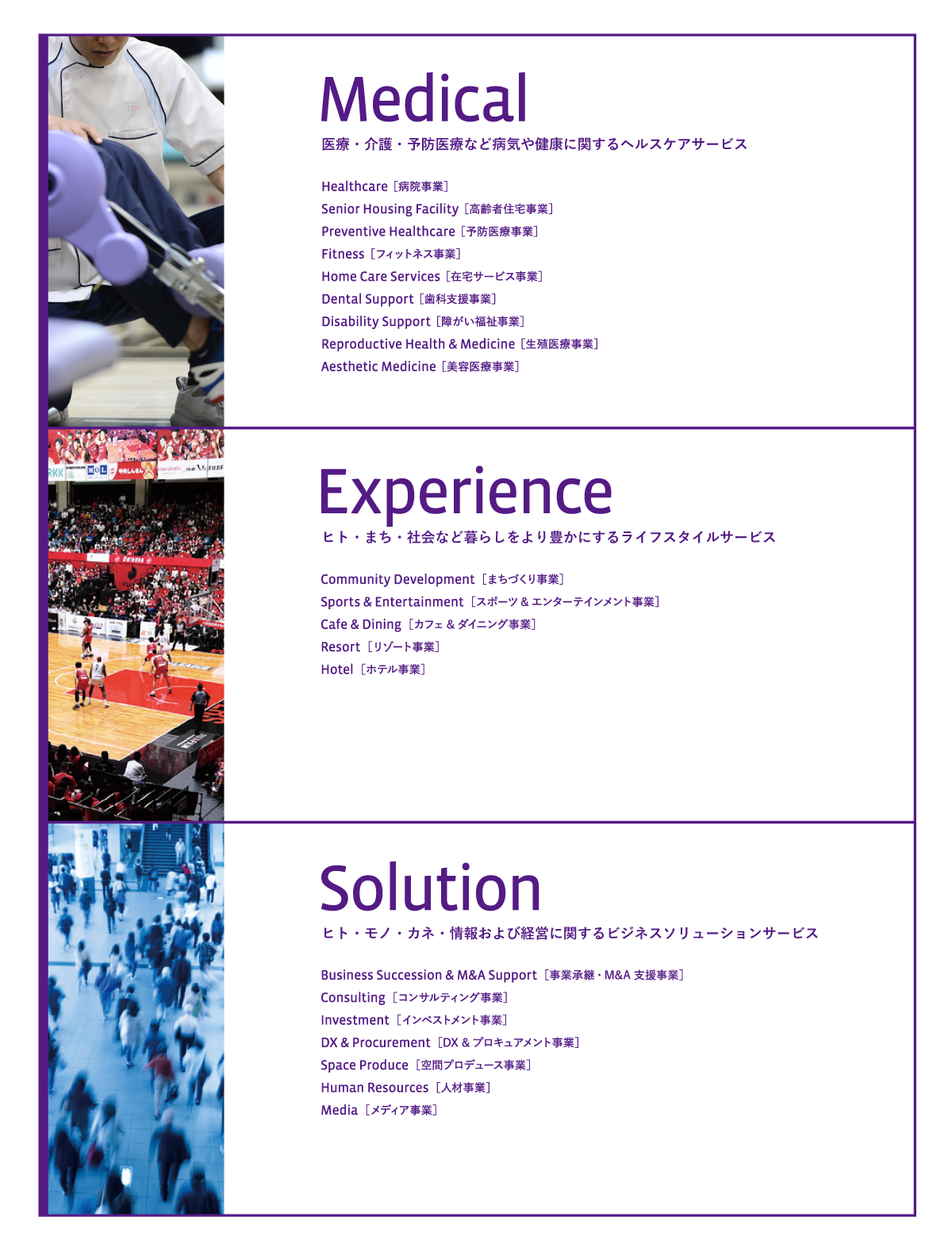 ヒト・モノ・カネ・情報といった経営基盤となるサービスを担う領域です。事業承継・M&A支援事業、コンサルティング事業、DX&プロキュアメント事業、人材事業、メディア事業などを通じて、グループ内外の事業創造と持続的な成長を支援します。 これら3つの事業領域は、それぞれが独立するのではなく、相互に連動しながら、一人ひとりの「生きる」を満たす価値を創出していきます。